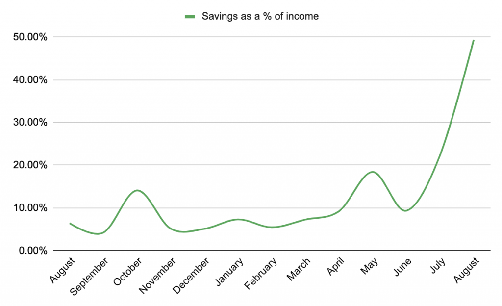 Financially, after much uncertainty this year, I’m happy to say that we actually earned much more than expected in August! This meant we could put almost half our income this month towards FIRE – more than ever before.