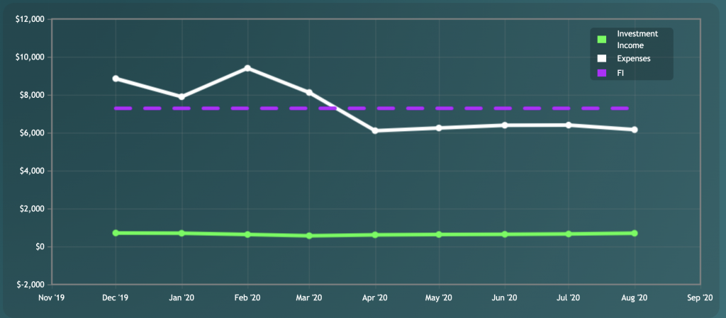 According to the FI Laboratory, we’ve moved four years closer to FI in August. Last month’s estimated FI date was April 2047. That is oversimplifying the journey ahead of us, but it’s satisfying to see progress being made.