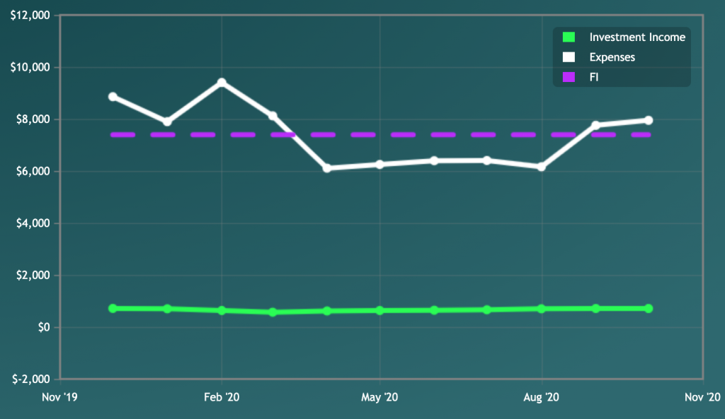 The whole lot all went straight into our RRSPs at Questrade and brought our total FIRE savings to $218,964 as of November 1. (Yes, that’s down from last month, because the markets took a dive during Covid’s second wave. We see it as a sale, where we can buy our ETFs for less than usual.)